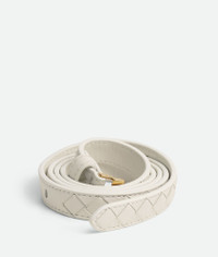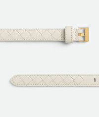 Intrecciato nappa leather belt with watch buckle. Product Details - Buckle closure - Material: lambskin - Lining: Calfskin - Color: Chalk - Hardware: Muse Brass finish - Height: 1.5 cm | 0.6” - Depth: 0.5 cm | 0.2” - Made in: Italy - Product code: 805803V4R019104