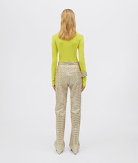 • Techno-knit top • Seamless ribbed knit in fine stretch viscose • Turtleneck • Long sleeves DETAILS Composition: 67% Viscose, 33% Polyester Color: Kiwi Made in Italy