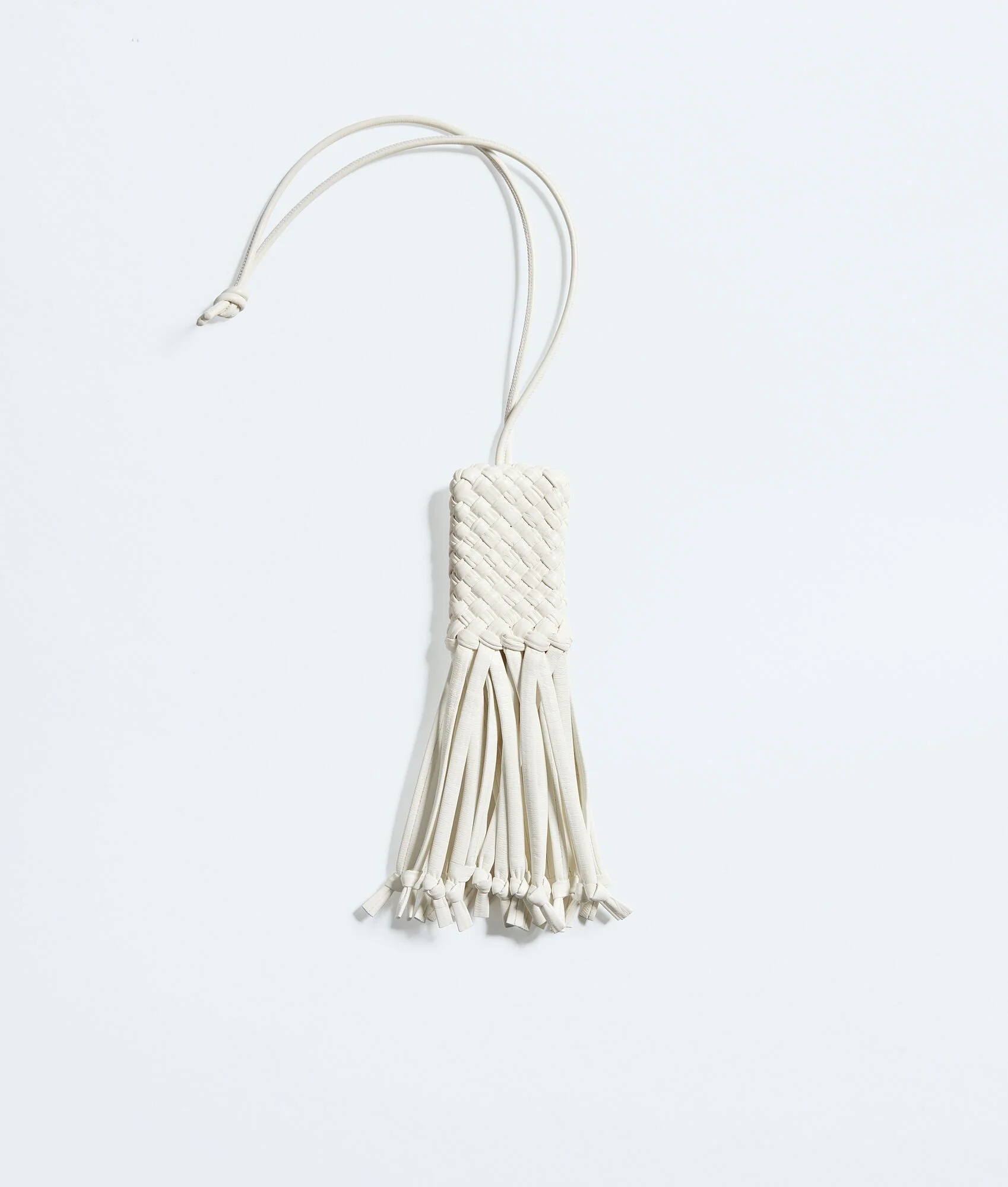 Product Details - Intreccio calfskin leather key holder - Single metal hook - Leather lanyard that attaches to any handle - Color: Alabaster - Hardware: Brass Vibrato finish - Lining: Unlined - Made in: Italy - Product code: 873237V2EZ09538 Material - Material: calfskin Size & Fit - Height: 8 cm | 3.1" - Width: 7 cm | 2.7" - Depth: 2 cm | 0.8" - Handle Drop: 35 cm | 13.8"