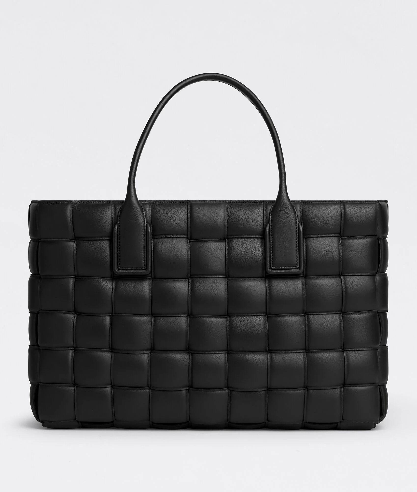 Large padded intreccio leather tote bag. Product Details - Large padded intreccio leather tote bag - Single detachable interior zipped pocket - Leather string closure - Material: lambskin - Lining: Lambskin bonded Intreccio - Color: Black - Hardware: Silver finish - Height: 50 cm | 13.9" - Width: 52 cm | 13.3" - Depth: 18 cm | 6.2" - Handle Drop: 19 cm | 8.6" - Made in: Italy - Product code: 592122VMBK18803