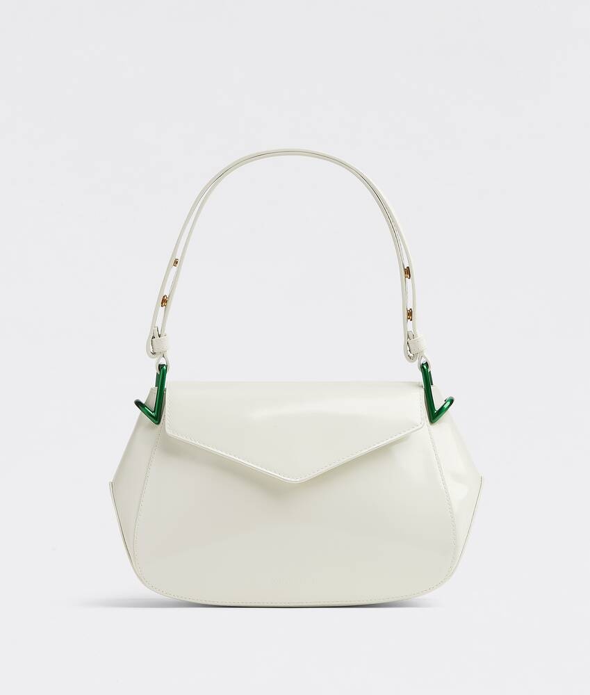 • Brushed leather cross-body bag • Single interior pocket • Flap closure Material: 100% Calfskin • Lining: Calfskin • Color: White • Hardware: Parakeet gold • Height: 19 cm | 7.4" • Width: 4.5 cm | 9.6" • Depth: 8 cm | 3.1" • Strap drop: 18 cm | 7.1" Made in: italy