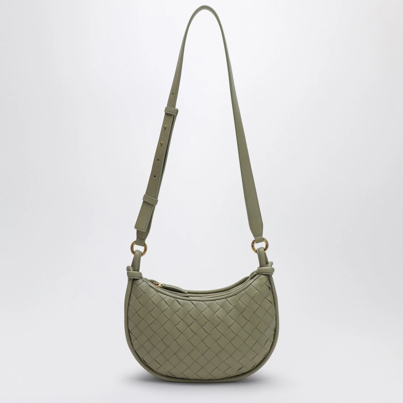 Travertine-coloured calfskin leather shoulder bag from Bottega Veneta featuring a half-moon design Intrecciato work an adjustable shoulder strap two main compartments and a zip fastening.