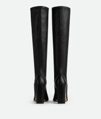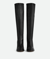 Knee-high boot in stretch lambskin featuring an elongated silhouette with almond Product details • Stretch leather knee-high boot Material: 100% Lambskin • Lining: Lambskin • Color: Black • Bio-based rubber-injected and biodegradable leather outsole • Heel: 9 cm | 3.5" Made in: Italy