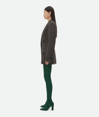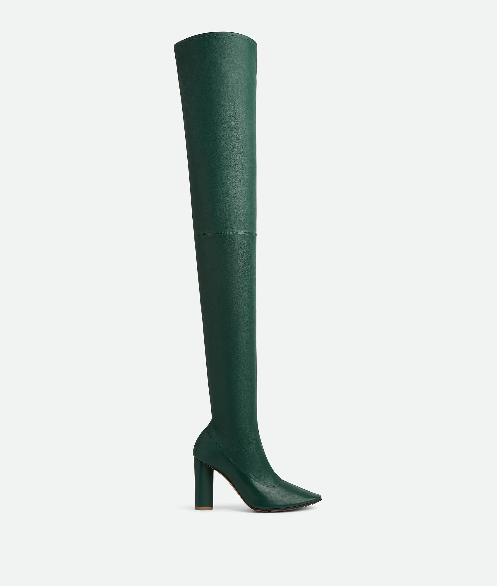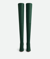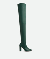 Over-the-knee boot in stretch lambskin featuring an elongated silhouette with almond Product details • Stretch leather over-the-knee boot Material: 100% Lambskin • Lining: Lambskin • Color: Emerald Green • Bio-based rubber-injected and biodegradable leather outsole • Heel: 9 cm | 3.5" Made in: Italy
