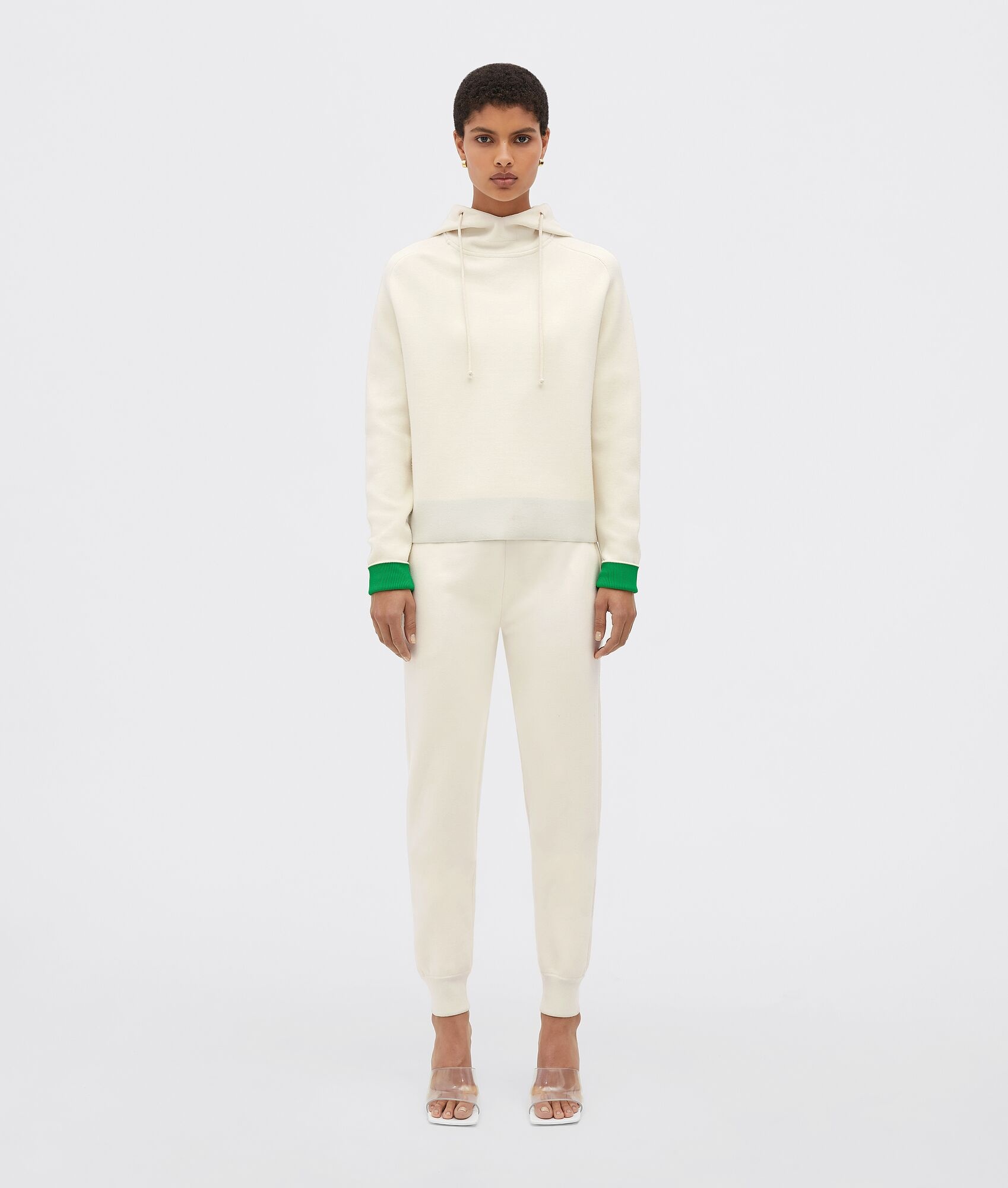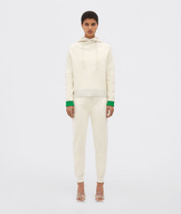 • Lightweight double merino wool jogger trousers • Contrasting parakeet interior edges • Elasticated waistband Material: 50% Wool, 30% Viscose, 10% Polyester, 5% Polyamide, 5% Elastane • Color: Sea Salt Made in: Italy
