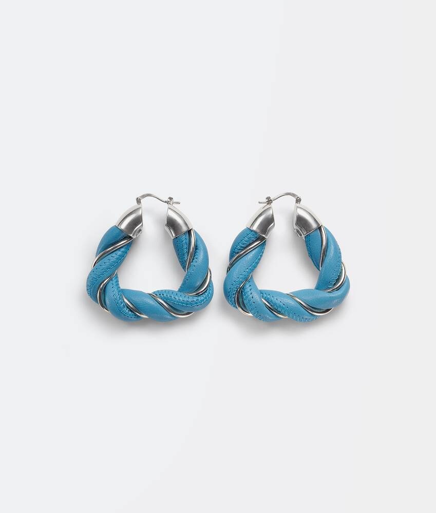 • Silver and leather twisted triangle hoop earrings Material: Silver, Lambskin • Color: Sky Blue • Width: 4.4 cm • Height: 4.1 cm Made in: italy