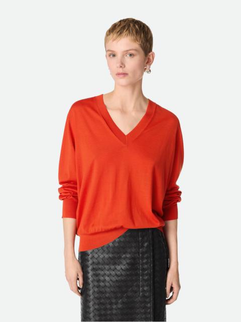 V-neck jumper in lightweight fine cashmere. Product Details - Lightweight fine cashmere V-neck jumper - "BV" embroidery on the front - Relaxed fit - Material: 100% cashmere - Color: Poppy - Made in: Italy - Product code: 811516V4B706233 Size & Fit - Model is 180 cm | 5'11" and is wearing a Bottega Veneta size S