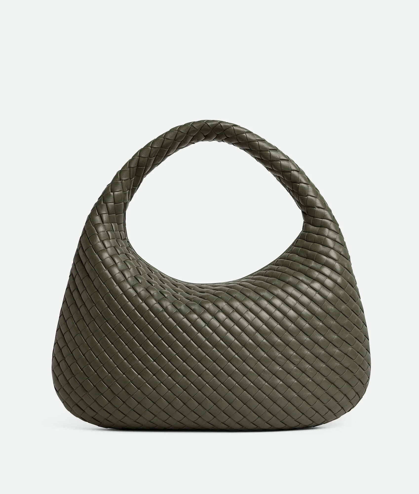Product Details - Padded Intrecciato supple leather shoulder bag - Single compartment with one zipped pocket - Zip closure - Lining: Suede - Color: Pickle - Hardware: Silver finish - Made in: Italy - Product code: 856737V66V03292 Material - Material: Lambskin Size & Fit - Height: 28 cm (11.0") - Width: 44 cm (17.3") - Depth: 5 cm (2.0") - Handle drop: 18 cm (7.1")