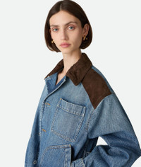 Jacket in vintage indigo washed denim with Intrecciato leather detail at the shoulder. Product Details - Vintage indigo washed denim jacket - Leather Intrecciato detail at the shoulder - Button closure - Relaxed fit - Color: Mid Blue - Made in: Italy - Product code: 837922V42W04715 Size & Fit - Model is 175 cm | 5'8" and is wearing a Bottega Veneta size 38