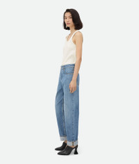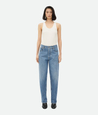 Jeans in vintage indigo washed denim. Product Details - Vintage indigo wash jeans - Tapered leg - Mid-rise waist - Turned-up hem - Button fly - Intrecciato suede back patch - Material: 81% cotton, 19% polyamide - Color: Mid Blue - Made in: Italy - Product code: 813502V42W04715 Size & Fit - Model is 178 cm | 5'10" and is wearing a Bottega Veneta size 38