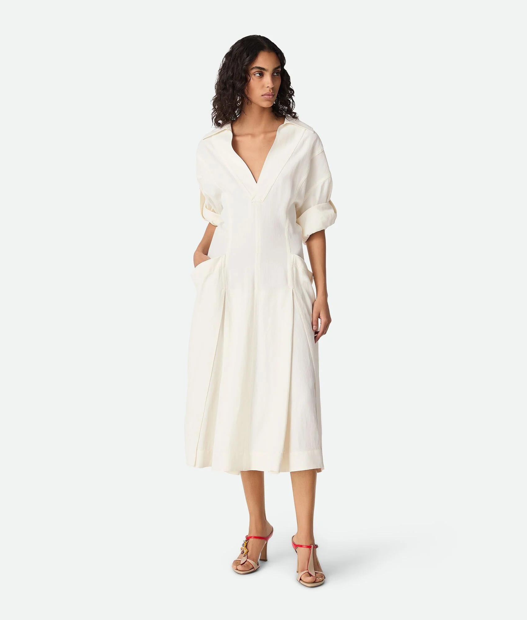 Midi dress in grainy viscose and linen with metal frog embellishments. Product Details - Grainy viscose and linen midi dress - Metal frog details - Zip and belt closure - Half lined - Material: 75% Viscose, 25% linen - Color: Chalk - Made in: Italy - Product code: 820007V3OZ09071 Size & Fit - Model is 176 cm | 5'9" and is wearing a Bottega Veneta size 38