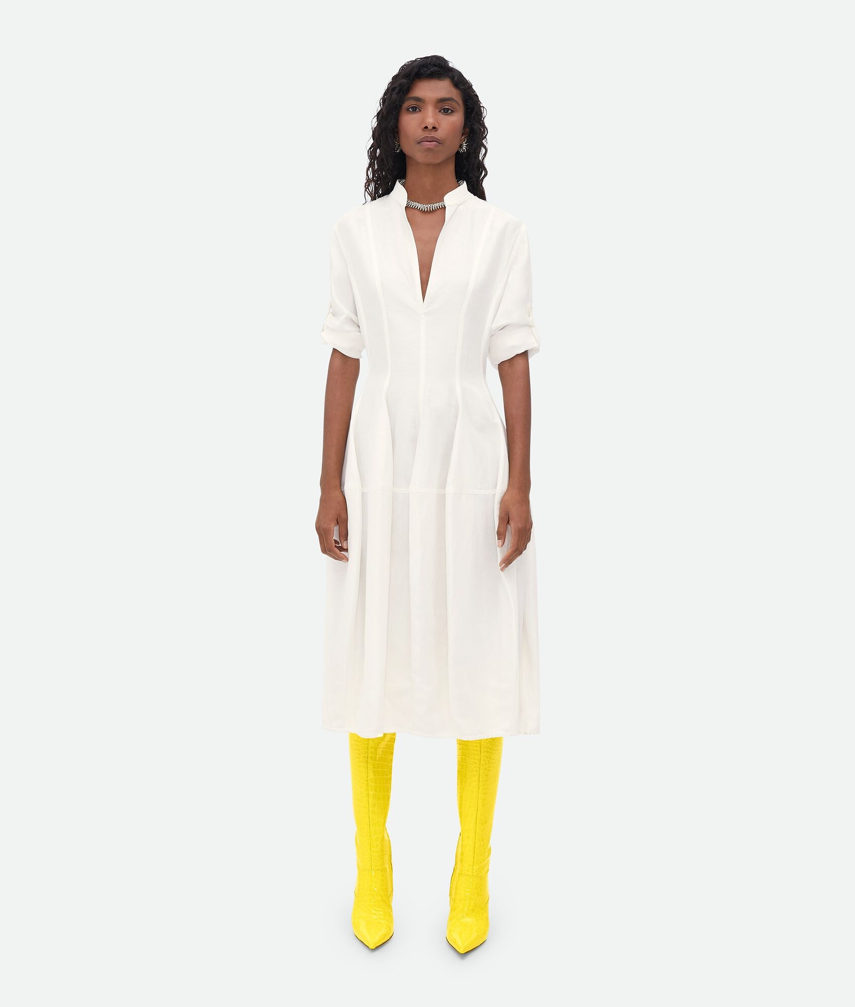 Viscose and linen dress. Product details • Viscose and linen dress • Rolled-up sleeves with button • Zip closure • Unlined • Regular fit Material: 55% Viscose, 45% Linen • Color: Chalk Made in: Italy Size & fit • Model is 175 cm | 5'8" and is wearing a Bottega Veneta size 38