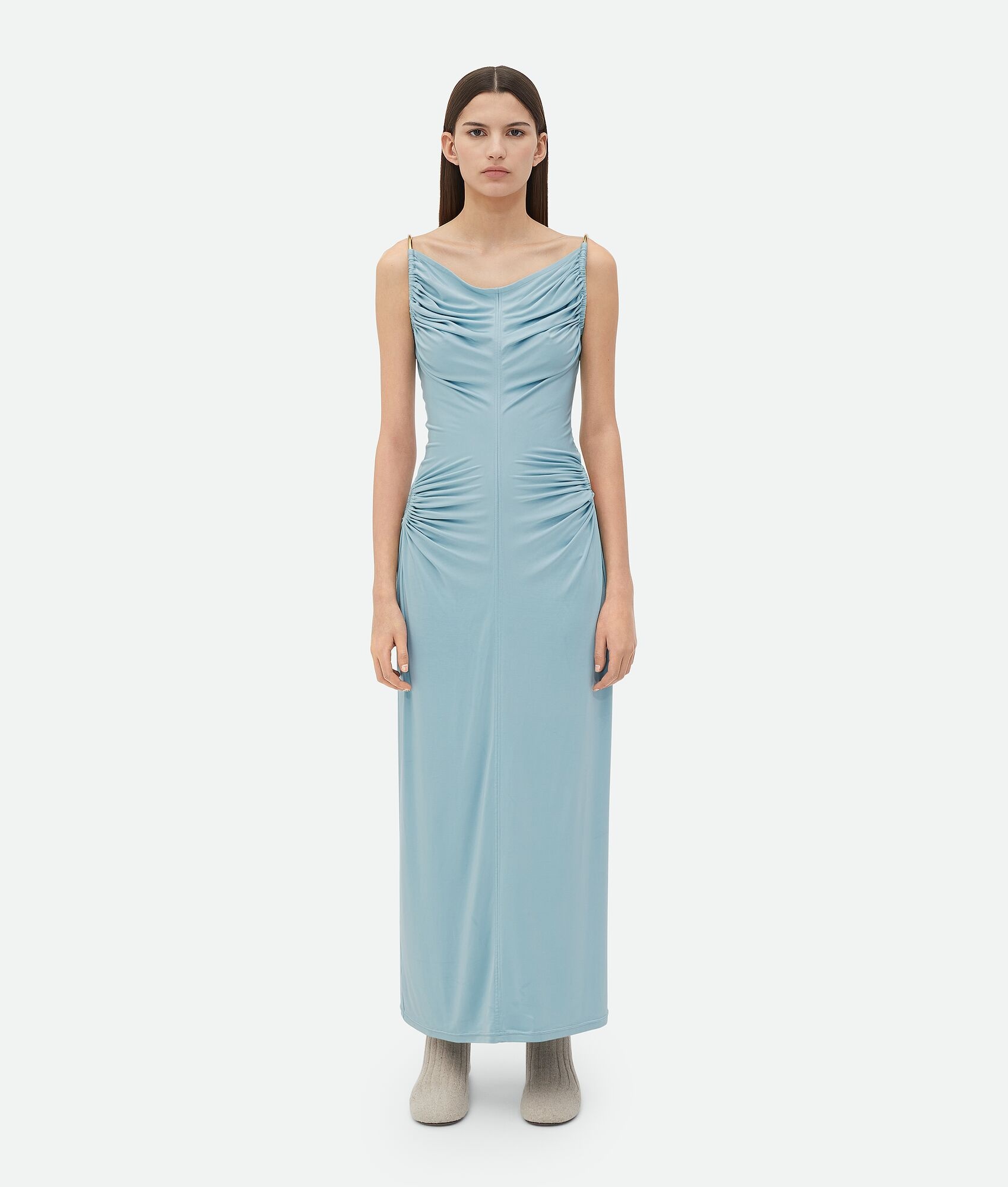 Long dress in viscose jersey. Product details • Viscose jersey long dress • Metal detail at shoulder • Zip closure • Unlined • Slim fit Material: 100% Viscose • Color: Mint Made in: Italy Size & fit • Model is 177 cm | 5'9" and is wearing a Bottega Veneta size 38