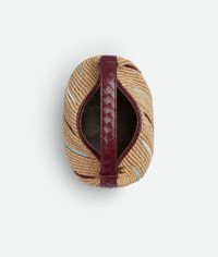 Shoulder bag in raffia torchon with contrasted leather detailing and adjustable strap. Product Details - Raffia torchon and multicolor leather stripes shoulder bag - Adjustable strap can be elongated from top handle to shoulder carry using the press studs - One main compartment - Zippered closure - Material: Nylon, cotton, calfskin - Lining: Calfskin - Color: Natural/Barolo/Zenith/White - Hardware: Gold finish - Height: 13cm - Width: 20cm - Depth: 9.5 cm 3.7" - Handle drop: 9cm - Made in: Italy - Product code: 827461V5GY09251 Size & Fit - Fits iPhone 16 Pro Max, a credit card case, airpods and keys.