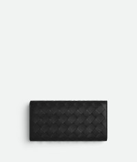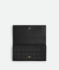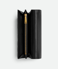 Intrecciato nappa leather wallet. Product Details - Twelve card slots, two bill compartments, one additional pocket, one zipped coin purse - Snap button closure - Material: lambskin, calfskin - Lining: Calfskin - Color: Black - Hardware: Gold finish - Height: 10 cm | 3.9" - Width: 19 cm | 7.5" - Depth: 3 cm | 1.2” - Made in: Italy - Product code: 814671VCPP38425