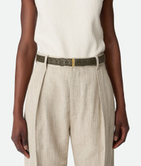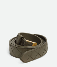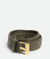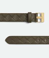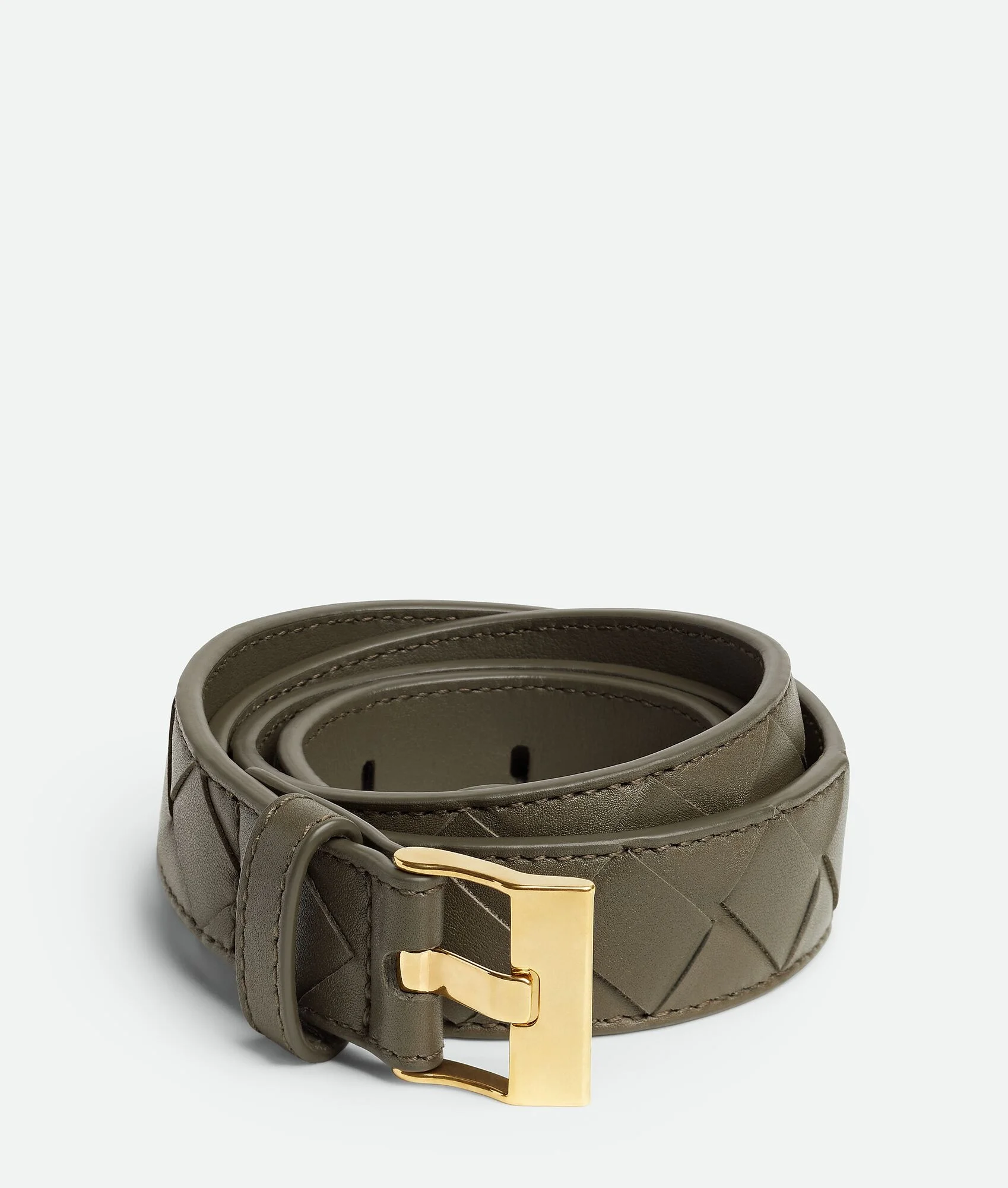 Belt in Intrecciato silky calf leather with watch buckle. Product Details - Intrecciato silky calf leather belt - Metal buckle - Prong closure - Material: Calfskin - Lining: Calf leather - Color: Cypress - Hardware: Muse Brass finish - Height: 2.5 cm | 1" - Depth: 0.5 cm | 0.2" - Made in: Italy - Product code: 799048V4R433230