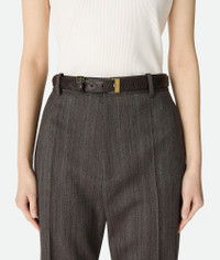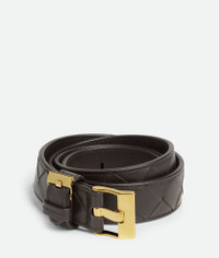 Belt in Intrecciato silky calf leather, featuring a loop with buckle detailing. Product Details - Intrecciato silky calf leather belt - Metal buckle - Leather loop with buckle detail - Prong closure - Lining: Calf leather - Color: Fondant - Hardware: Muse Brass finish - Height: 2.5 cm | 1" - Depth: 0.5 cm | 0.2" - Made in: Italy - Product code: 837002V4R432190