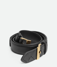 Belt in silky calf leather with double watch buckle and Intrecciato front detail. Product Details - Silky calf leather belt - Intrecciato leather front detail - Double metal buckle - Double prong closure - Lining: Calf leather - Color: Black - Hardware: Muse Brass finish - Height: 2.5 cm | 1" - Depth: 0.5 cm | 0.2" - Made in: Italy - Product code: 836927V4R451019
