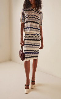 Bottega Veneta (meaning "Venetian Artisanal Workshop" in its native Italian) unites different people, ideas, and perspectives with an unwavering commitment to excellence and a unique vision of luxury. With solid foundation, each season builds off the other, delivering new iterations of coveted house signatures with contemporary, yet timeless, flare. This knit polo top features a wavy design with semi-sheer spaces in-between. Pair it with the matching skirt. PRODUCT DETAILS - Pre-Fall '25 - Slip on - Composition: 82% Cotton, 18% Polyamide - Dry clean - Made in Italy SIZE & FIT - Designed for a relaxed fit