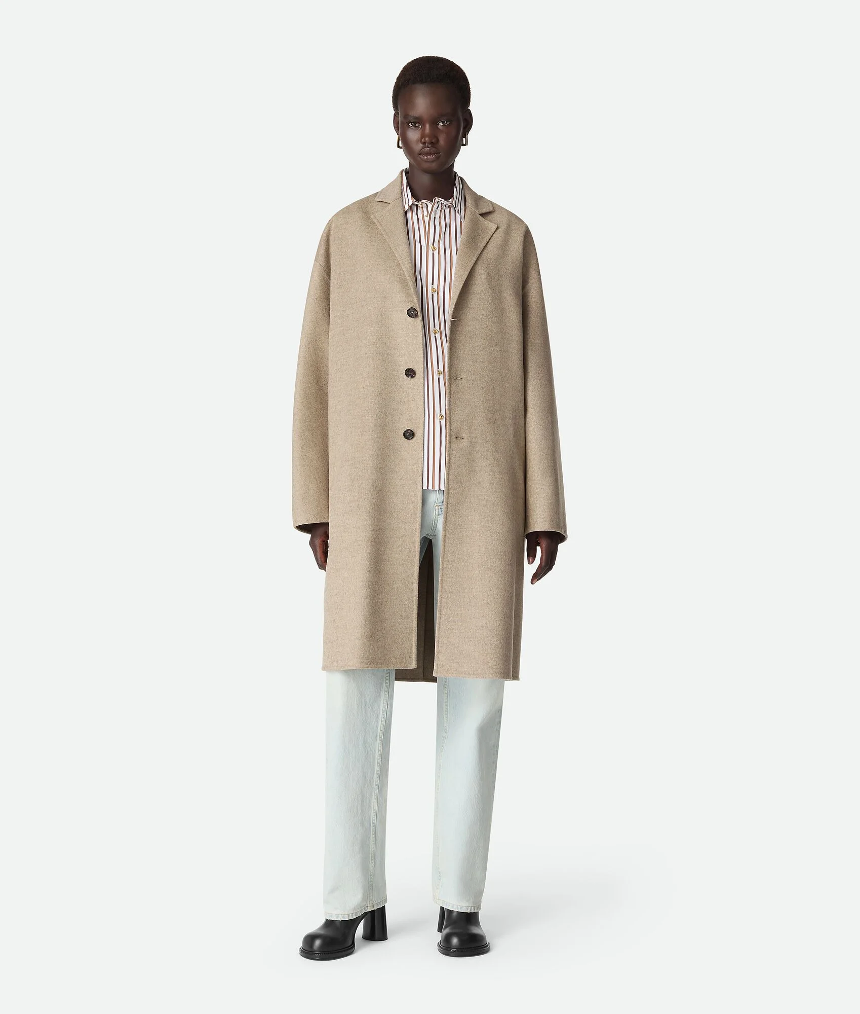 Single breasted coat in lightweight double wool and cashmere. Product Details - Lightweight double wool and cashmere coat - Single-breasted - Button closure - Unlined - Regular fit - Color: Sandshell Melange - Made in: Italy - Product code: 838060V3OO02783 Material - Material: 80% Wool, 20% cashmere Size & Fit - Model is 179 cm | 5'10" and is wearing a Bottega Veneta size 38