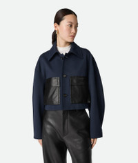 Jacket realised in compact wool and cotton twill with leather pockets. Product Details - Compact wool and cotton twill jacket - Leather pockets - Button closure - Fully lined - Relaxed fit - Color: Midnight Blue - Made in: Italy - Product code: 841453V5P404246 Size & Fit - Model is 178 cm | 5'10" and is wearing a Bottega Veneta size 38