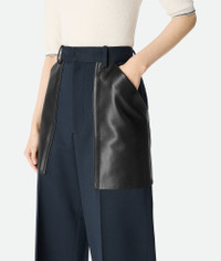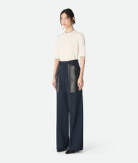 Trousers with wide leg realised in compact wool and cotton twill with leather pockets. Product Details - Compact wool and cotton twill pants - Wide Leg - Leather pockets - Zip, hook and button closure - Color: Midnight Blue - Made in: Italy - Product code: 838347V5P404246 Size & Fit - Model is 176 cm | 5'9" and is wearing a Bottega Veneta size 38