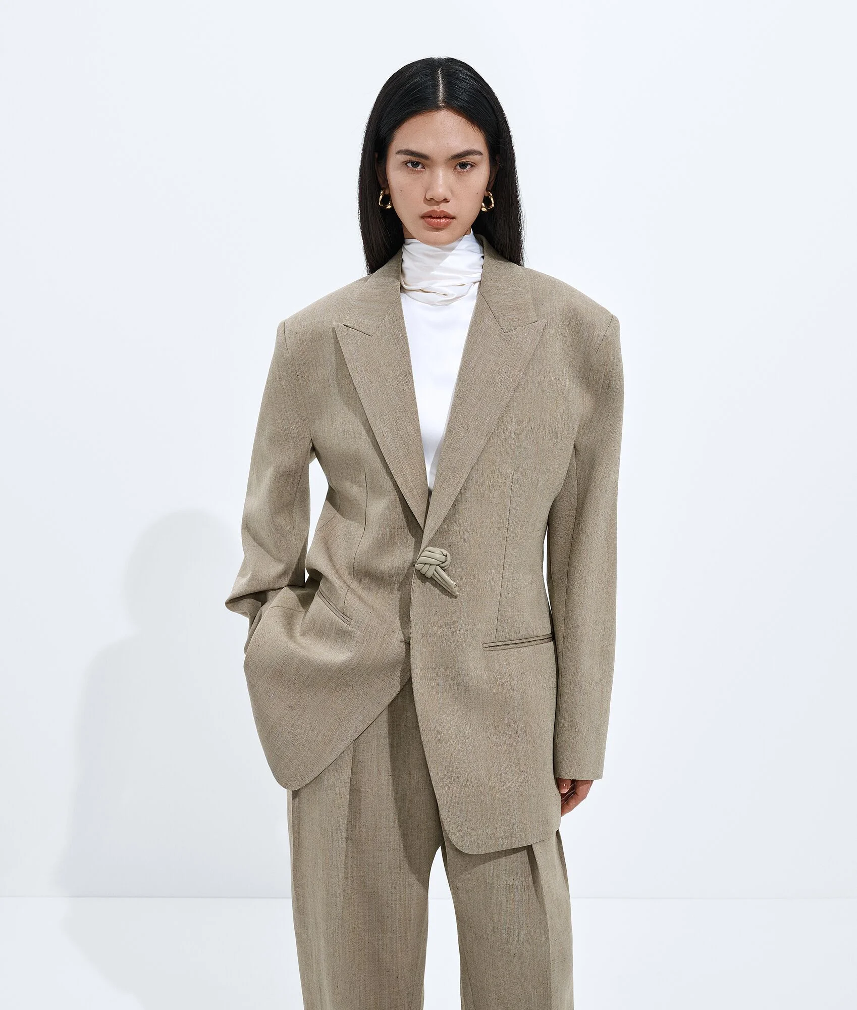 Product Details - Wool and linen melange toile jacket - Leather knot button - Cabat shoulder construction - Button closure - Fully lined - Relaxed fit - Color: Green/Lava Mel - Made in: Italy - Product code: 861430V6DL03133 Material - Material: 62% wool, 23% linen, 10% viscose, 5% polyester Size & Fit - Model is 175 cm | 5'10" and is wearing a Bottega Veneta size 38