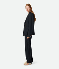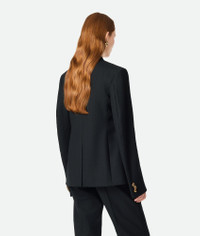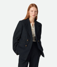 Double breasted jacket in subtle striped wool with gold-finished buttons. Product Details - Subtle striped wool double breasted jacket - Gold-finish knot buttons - Fully lined - Button closure - Regular fit - Material: 100% cotton - Color: Black/Dark Blue - Made in: Italy - Product code: 815668V36K01292 Size & Fit - Model is 177 cm | 5'9" and is wearing a Bottega Veneta size 38