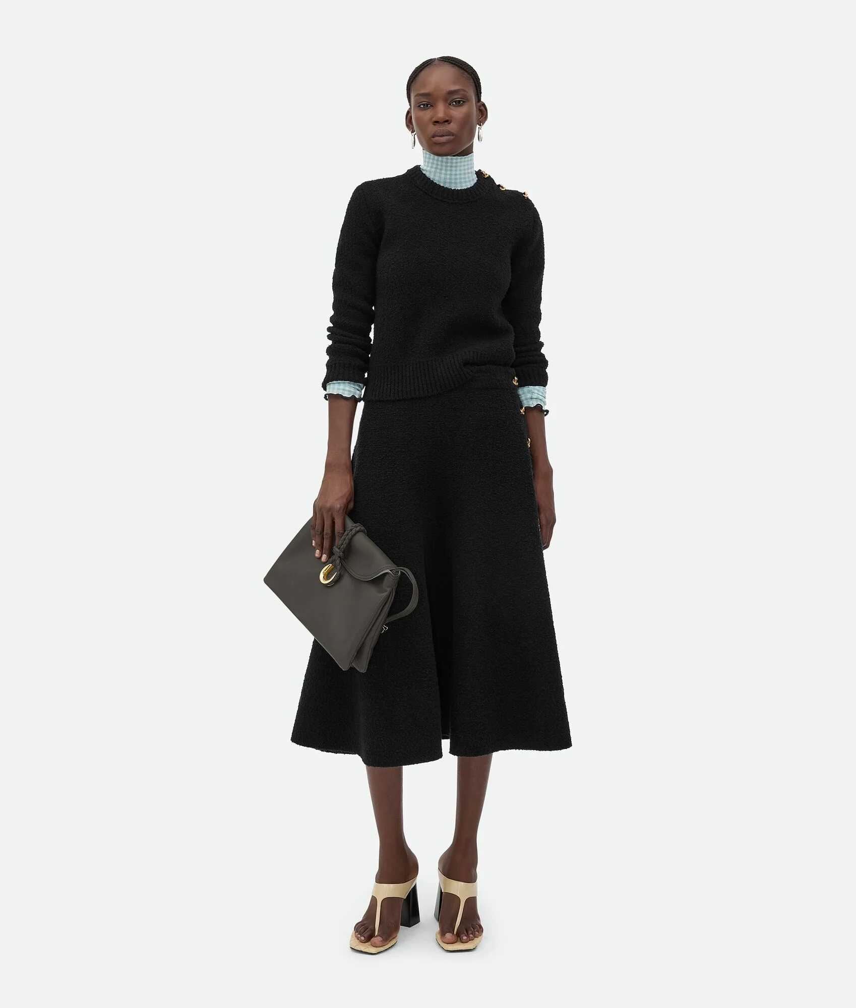 Jumper in wool boucle. Product Details - Wool boucle jumper - Metal knot buttons on the shoulder - Regular fit - Material: 49% cotton, 41% wool, 9% polyamide, 1% elastane - Color: Black - Made in: Italy - Product code: 811503V4WQ01000 Size & Fit - Model is 181 cm | 5'11" and is wearing a Bottega Veneta size S