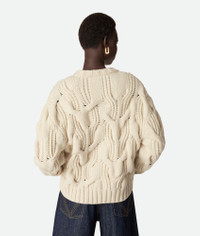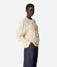 Cropped cardigan in 3D twisted cable wool. Product Details - Twisted cable wool cropped cardigan - Button closure - Regular fit - Color: String - Made in: Italy - Product code: 843996V5LO02945 Material - Material: 100% Virgin wool Size & Fit - Model is 179 cm | 5'10" and is wearing a Bottega Veneta size S