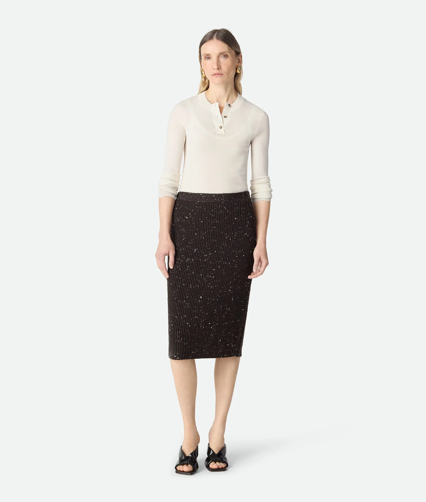 Elasticated midi skirt in English wool rib. Product Details - Wool English rib midi skirt - Elasticated waistband - Color: Fondant - Made in: Italy - Product code: 793108V5LV02113 Material - Material: 98% Wool, 2% Viscose Size & Fit - Model is 177 cm | 5'9" and is wearing a Bottega Veneta size S