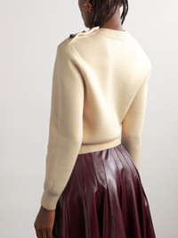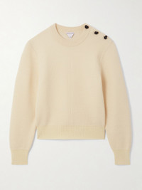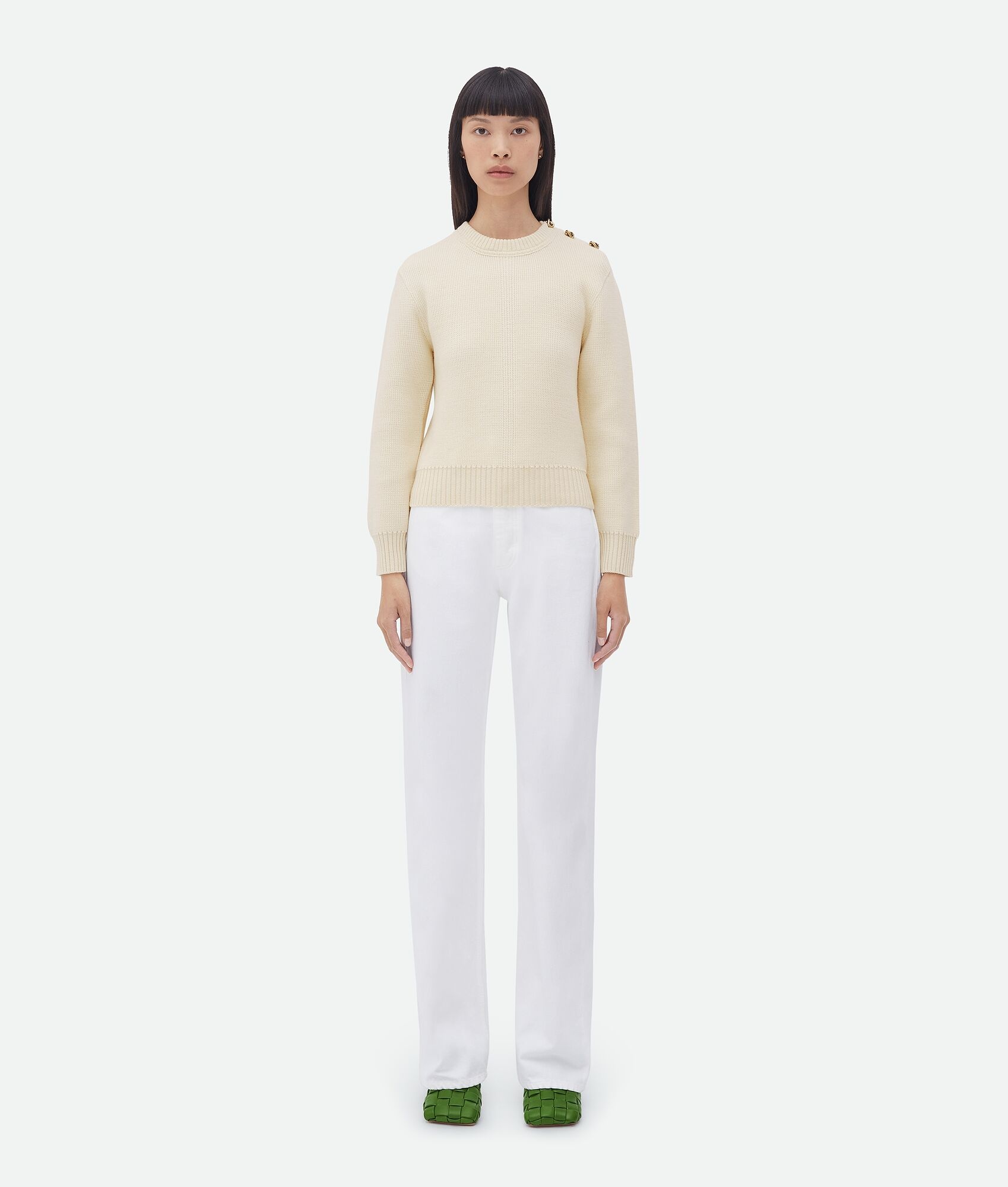 Medium weight dry wool jumper. Product Details - Medium weight dry wool jumper - Metal knot buttons at shoulder - Shrunken fit - Material: 100% Wool - Color: Bone - Made in: Italy - Product code: 725634V2M509267 Size & Fit - Model is 177 cm | 5'9" and is wearing a Bottega Veneta size S