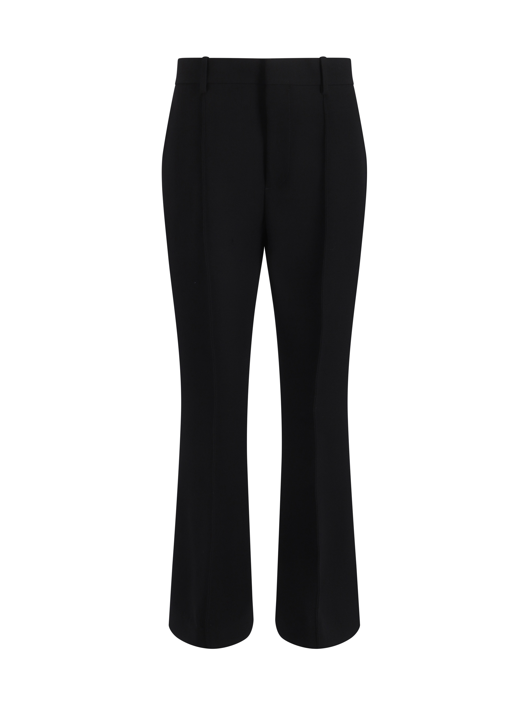 Wool Pants by Bottega Veneta, trumpet style, front zipper and hook-and-eye closure, waistband loops, two side welt pockets, two welt pockets with flap at back, monochrome pattern, regular fit. DETAILS sku 810473V4MD0_1000 composition: WOOL 100% color group: BLACK gender: WOMAN season: AW24 size chart: RTW IT category name: PANTS icon: icon
