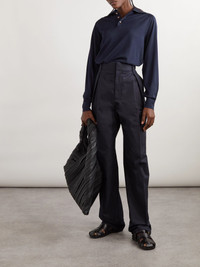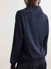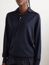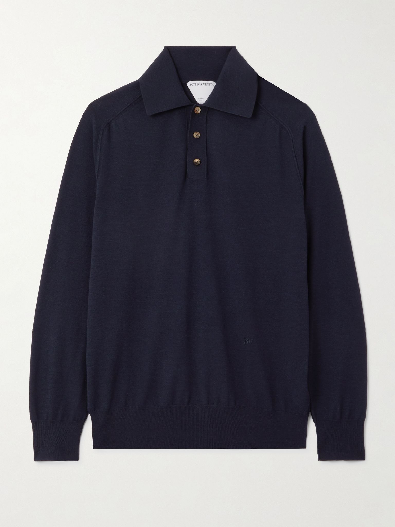 Bottega Veneta's polo shirt is made from wool that's smooth and drapes fluidly. It's knitted in relaxed proportions and has raglan sleeves that are accentuated by raised seaming. Style yours with high-rise pants and midi skirts. Details & Care - Navy wool - Button fastenings along front - 100% wool; button: 100% horn (Buffalo)