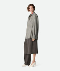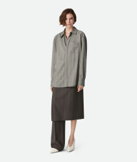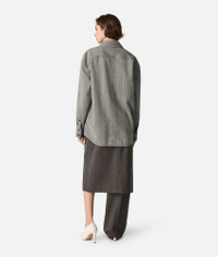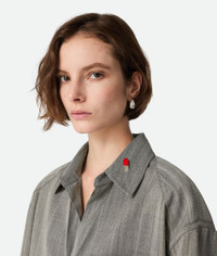 Shirt in subtle stripe melange wool with enamelled matches. Product Details - Melange wool subtle stripe shirt - Enameled matches - Button closure - Relaxed fit - Material: 98% Wool, 1% cotton, 1% viscose - Color: Vulcano/Bean Melange - Made in: Italy - Product code: 819885V5C501649 Size & Fit - Model is 174 cm | 5'8" and is wearing a Bottega Veneta size 38