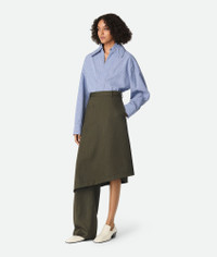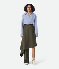 Midi skirt with trouser leg and asymmetrical silhouette in subtle stripe melange Product Details - Melange wool subtle stripe asymmetrical midi skirt trousers - Zip, hook and button closure - Straight leg - Material: 100% Wool - Color: Forest/Caper Melange - Made in: Italy - Product code: 819911V5C403541 Size & Fit - Model is 179 cm | 5'10" and is wearing a Bottega Veneta size 38