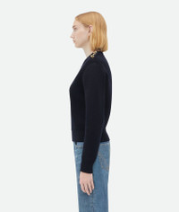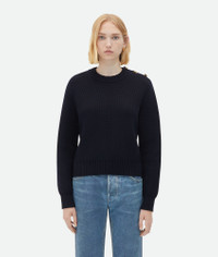 Jumper with signature gold metal knot buttons at the shoulder. Realised in warm compact Product Details - Dry wool crew neck sweater - Metal knot buttons on shoulder - Regular fit - Material: 100% Wool - Color: Abyss - Made in: Italy - Product code: 769368V2M504140 Size & Fit - Model is 178 cm | 5'10" and is wearing a Bottega Veneta size S