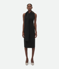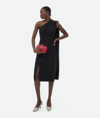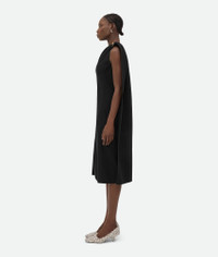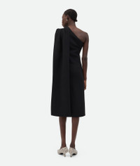 Asymmetrical dress in double wool viscose crepe. Product Details - Double wool viscose crepe asymmetric dress - Drape detail with metal knot buttons at shoulder - Zipper closure - Material: 46% wool, 44% viscose, 10% polyamide - Color: Black - Made in: Italy - Product code: 812348V4ZE01000 Size & Fit - Model is 181 cm | 5'11" and is wearing a Bottega Veneta size 38