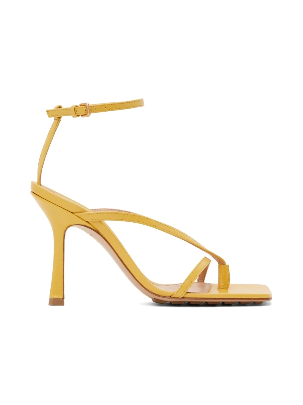 Buffed nappa lambskin sandals in yellow. Open square toe. Adjustable pin-buckle ankle strap. Logo embossed at taupe buffed lambskin footbed. Covered stiletto heel. Leather sole in beige featuring pebbled rubber injection. Gold-tone hardware. Approx. 3.5" heel. Supplier color: Buttercup Upper: lambskin. Sole: leather, rubber. Made in Italy 211798F125004