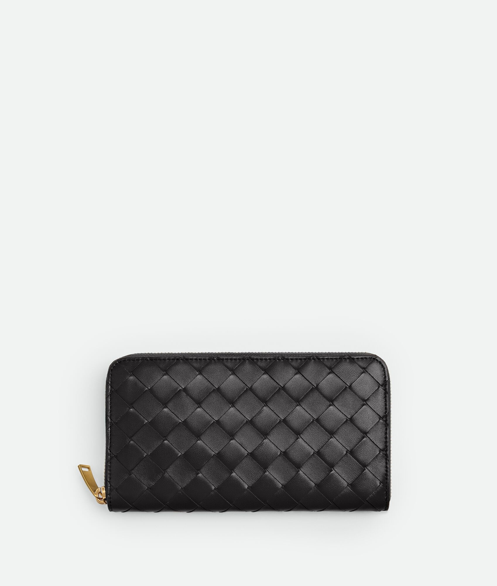 Intrecciato leather wallet. Make it unique with a handmade customization by Product details • Intrecciato leather wallet • Eight card slots, two bill compartments, two additional pockets, one zippered coin purse • Zipper closure Material: 100% Lambskin • Lining: Calfskin • Color: Black • Hardware: Gold finish • Height: 10 cm • Width: 19 cm • Depth: 2 cm Made in: Italy