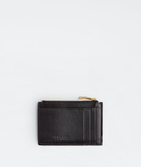 • Intrecciato leather card holder • Three card slots, one additional pocket, one zipped coin purse Material: 50% Lambskin, 50% Calfskin • Lining: Calfskin • Color: Black • Hardware: Gold finish • Height: 8 cm • Width: 12 cm • Depth: 0.5 cm Made in: italy