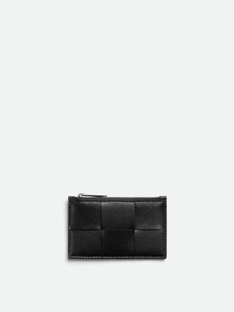 Product Details - Intreccio leather card case - Three card slots, one zippered coin purse - Material: calfskin - Lining: Calfskin - Color: Black - Hardware: Silver finish - Height: 7.5 cm | 3" - Width: 11.8 cm | 4.6" - Depth: 0.5 cm | 0.2" - Made in: Italy - Product code: 749456VBWD38803