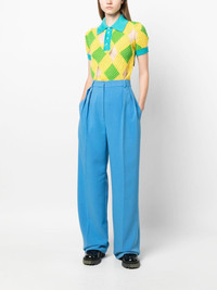 geometric-pattern knitted polo shirt Highlights - Yellow/bright green/aqua blue - Virgin wool blend - Crochet knit - Geometric panelled design - Contrasting border - Semi-sheer panels - Polo collar - Short front button fastening - Short sleeves - Ribbed cuffs and hem Imported Composition Virgin Wool 94%, Polyester 6% SIZE & FIT Model measurements Height 5 ft 9 in(1.75 m) Bust/Chest 31.1 in(79 cm) Hips 33.46 in(85 cm) Waist 23.22 in(59 cm)