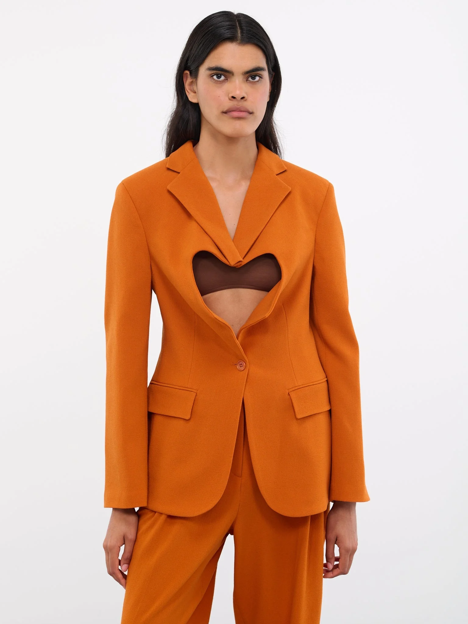BOTTER jacket in orange, heart cut-out, crepe construction, notched lapel collar, padded shoulders, tonal button closure & cuffs, flap pockets, back vent, fully lined, tailored fit. Italian Sizing Body - 92% Polyester, 8% Elastane Lining - 100% Viscose Model is 5'11" wearing size 36. Bust: 32” Waist: 24” Hip: 35"