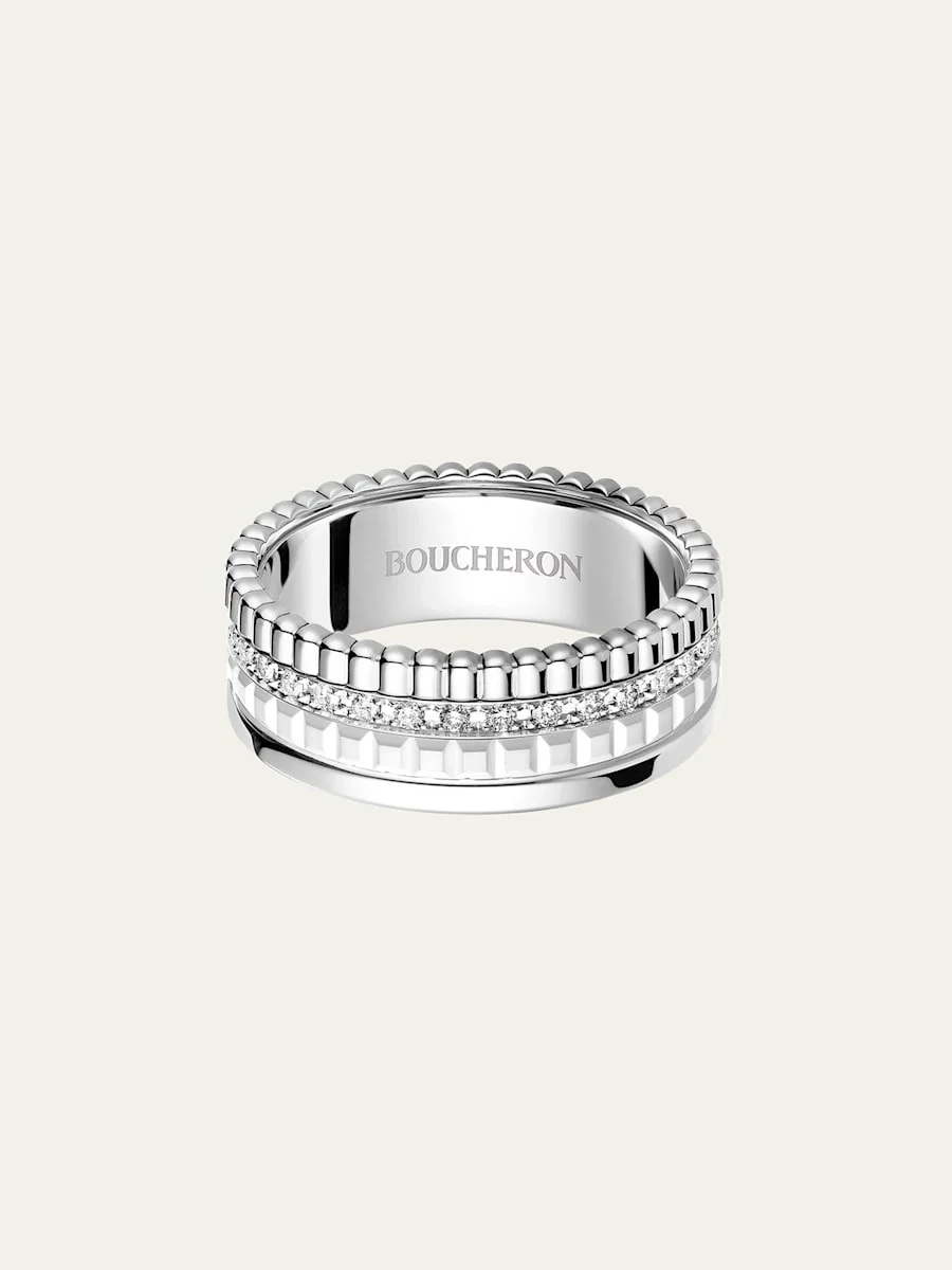 Boucheron band ring Polished 18-karat white gold and white ceramic 33 white diamonds 0.26 total diamond carat weight Wipe clean Made in Switzerland Online Inquiries: BGS21_PFUVK| Store Inquiries: #4568543