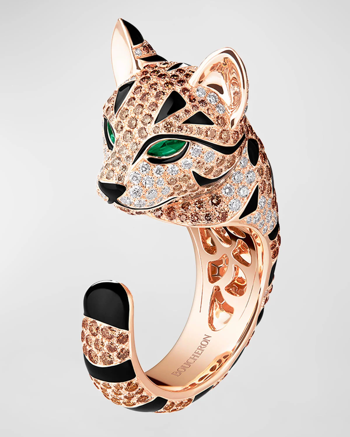 - Fuzzy, the leopard cat got his spotted fur and its name from the Bengal leopard. As the symbol of courage and freedom, this adorable ring is the ideal companion for independent and delicate women. - Boucheron tapered ring - Approx. ring size EU 55 - Polished 18-karat rose gold with black lacquer - 401 champagne diamonds; 2.99 total carat weight - 80 white diamonds; 0.53 total carat weight - Two cabochon emeralds; 0.13 total carat weight - Wipe with a clean, dry cloth - Boucheron Style # JRG02687