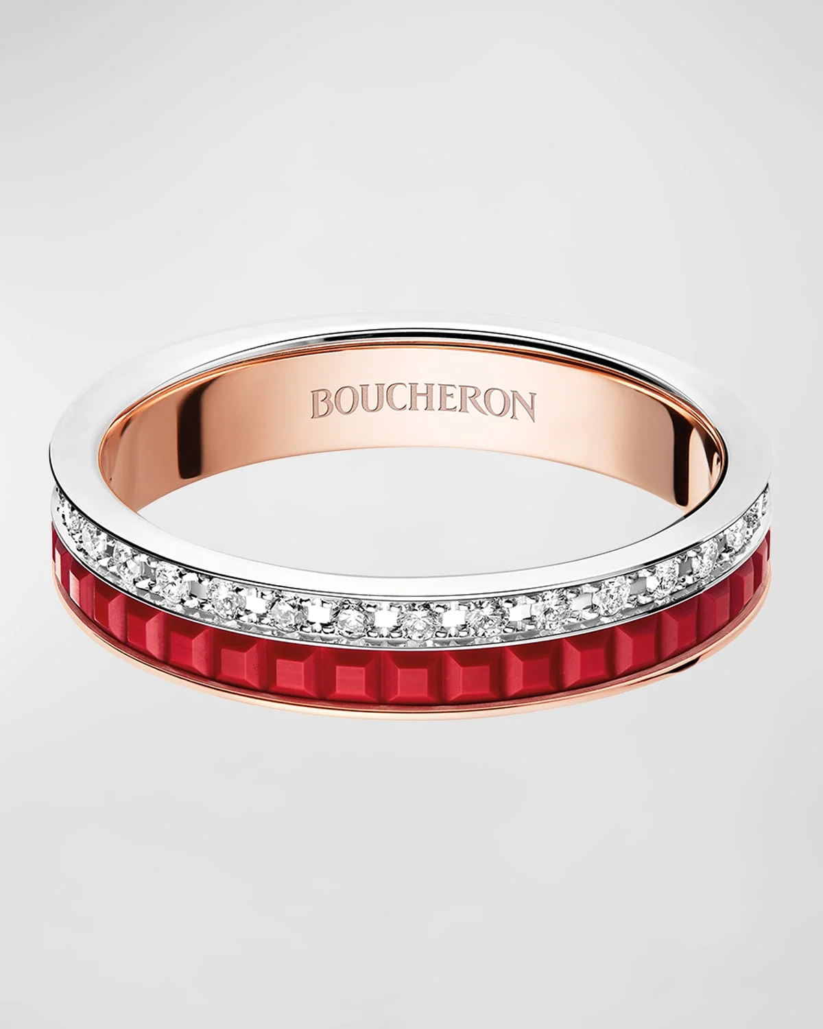 - A bold red ceramic takes on the Clou de Paris, like a wave of passion taking over the French capital. The Quatre Red Edition wedding band challenges conventions. The deep red of ceramic meets pink or white gold for an ultra-graphic combination. Worn on its own, it emphasizes your outfit with an elegant touch. Worn with other pieces, it asserts your freedom. - Boucheron ring with diamonds - 18-karat pink and white gold - Red ceramic and diamonds - Width: 3.8 mm - Total carat weight: 0.24 - Runs small; we recommend ordering 1 size up - Wipe with a clean, dry cloth - Made in Switzerland - Boucheron Style # JAL00265