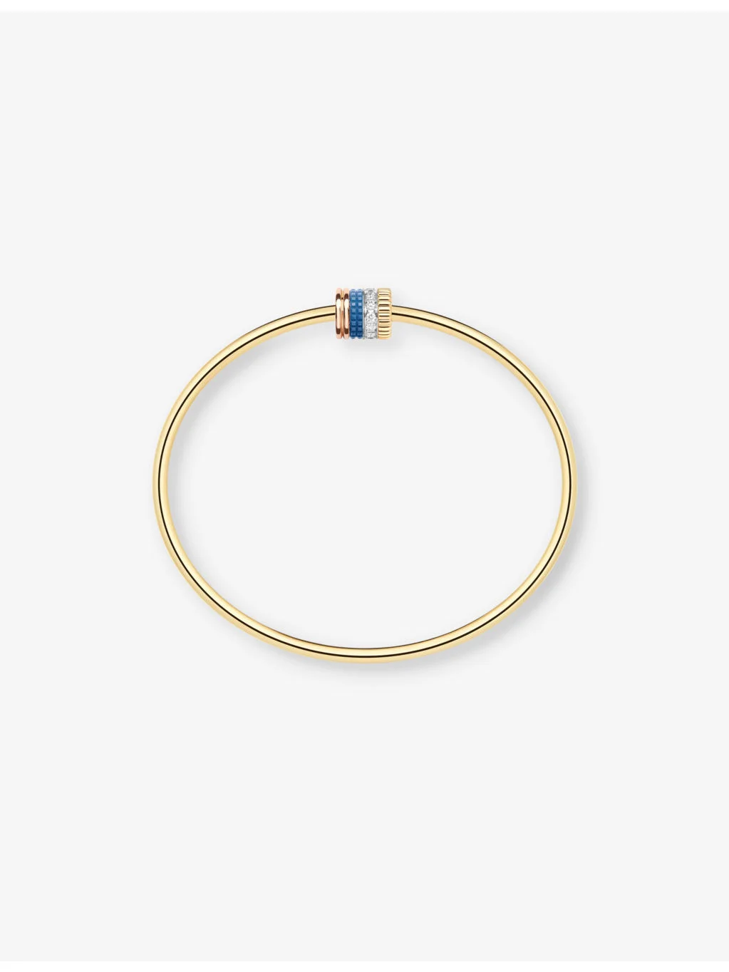 PRODUCT DETAILS - Boucheron Quatre blue-edition 18ct yellow, white and rose-gold, 0.11ct diamond and ceramic bracelet - 100% 18ct yellow gold, 100% 18ct white gold, 100% 18ct rose gold - 11 diamonds - Slips on - Polished finish, grosgrain pattern, blue edition - Carat: 0.11ct - Cut: round - Clarity: FL-VS2 - Colour: D-G - Dimension: motif diameter 7.6mm, length 8.3mm - Made in Italy - Wipe it with a dry, clean cloth - Presented in a Boucheron box. This product comes with a Boucheron certificate of authenticity Ref: R04313104