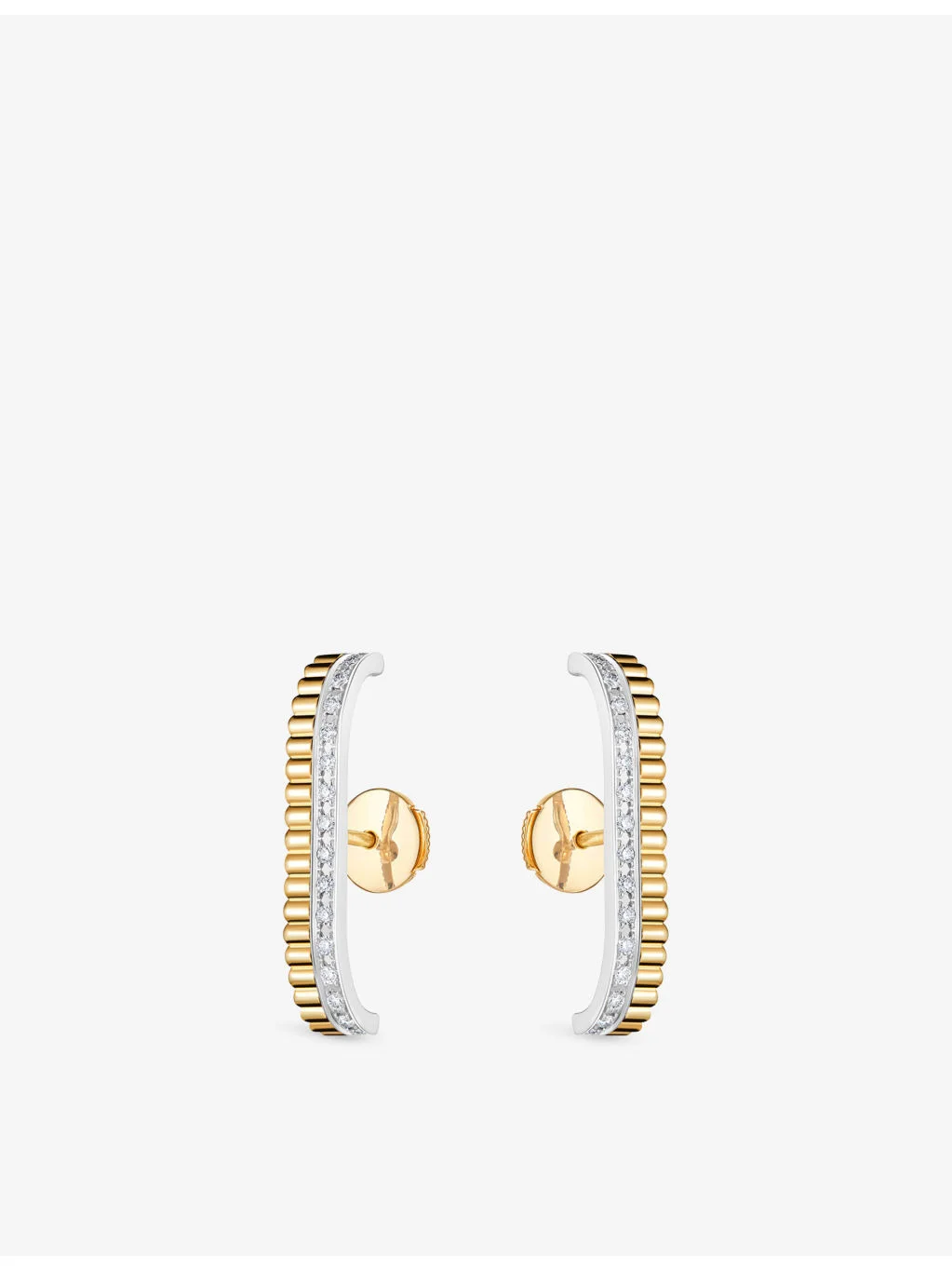 PRODUCT DETAILS - Boucheron 18ct Yellow, White Gold And 0.26ct Diamond Stud Earrings - 100% 18ct yellow, white gold - 32 diamonds - Post-back fastening - Quatre collection, hugs the shape of the lobe, Grosgrain pattern with diamonds - Carat weight: 0.26ct - Made in Switzerland - Please use a soft, dry polishing cloth - Presented in a Boucheron box. This product comes with a Boucheron certificate of authenticity - We regret that for hygiene reasons, earrings cannot be exchanged or refunded, unless faulty. Ref: R04513665