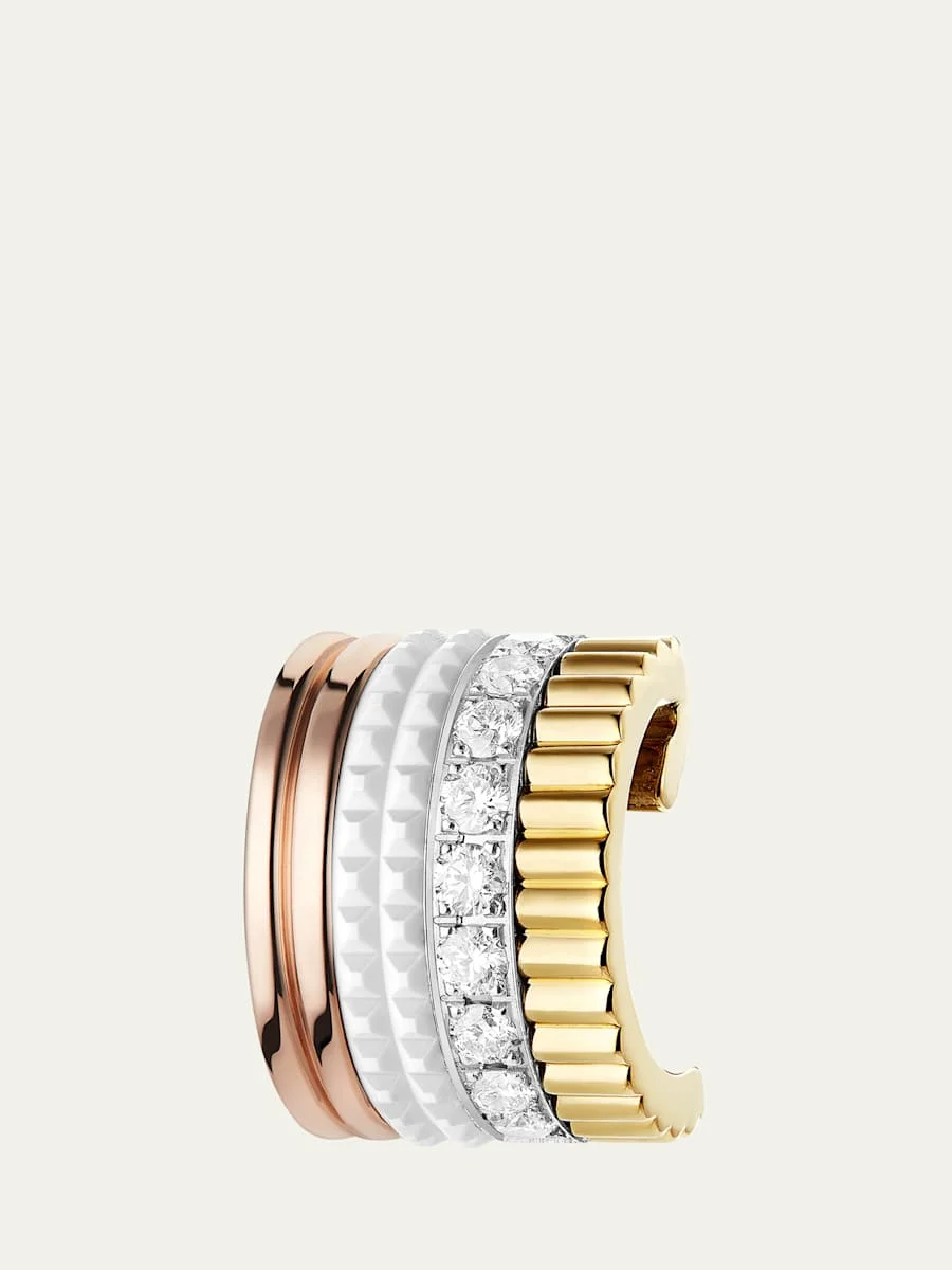 Boucheron single clip-on earring Yellow, white, rose 18-karat gold and white ceramic 9 channel-set white diamonds 0.14 total diamond carat weight Clip-on backs Sold individually Wipe clean Made in Switzerland Online Inquiries: BGS21_PN2T8| Store Inquiries: #4401582